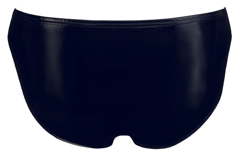 Klassischer schwarzer Slip aus längs- und querelastischem 4-Wege-Stretch-Lack mit unterlegtem Front-Reißverschluss aus silberfarbenem Metall.