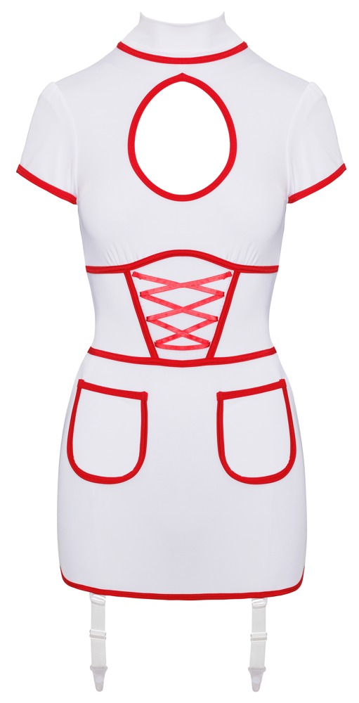 Das kurze Strapskleid ist figurbetonend und semi-transparent. In Weiß gehalten und mit der Signalfarbe Rot sind die einzelnen Details hervorgehoben. So sticht unter anderem der große Cut-out im Dekolleté, die aufgesetzten Taschen und die dekorative Zierschnürung hervor. Unter der Zierschnürung befindet sich ein Powerneteinsatz. Der kleine Stehkragen wird im Nacken durch zwei Knöpfe geöffnet. Die verstellbaren Strumpfhalter kannst du auch komplett abnehmen.