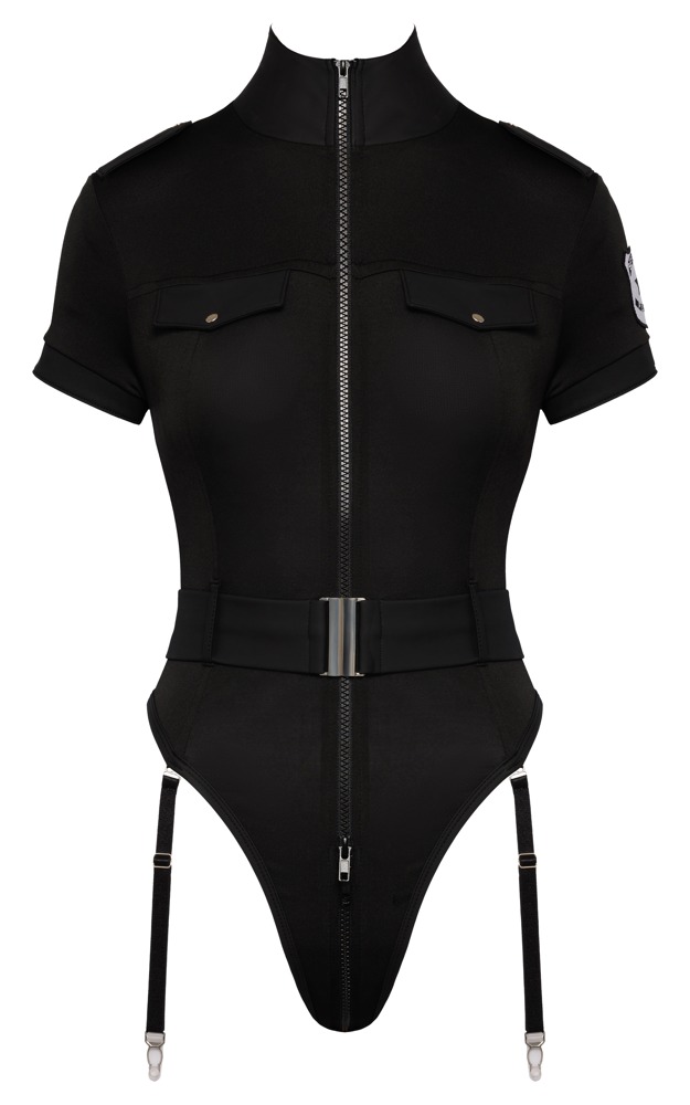 Erlebe den aufregenden Special Police Style mit diesem schwarzen Straps-Body von Cottelli COSTUMES. Der Body beeindruckt mit einem auffälligen Emblem auf dem linken Arm und einem Materialmix aus weichem Stretch und matt glänzendem Wetlook. Hochgeschlossen und streng mit halbem Arm, sowie Schulter- und Brustklappen, bietet er den typischen Polizei-Look. Der Body verfügt über Schlaufen für den beiliegenden Stretchgürtel mit schöner silberfarbener Schließe. Der durchgehende 3-Wege-Reißverschluss verläuft vom hohen Stehkragen bis in den Schritt, und die Strumpfhalter sind verstell- und abnehmbar.