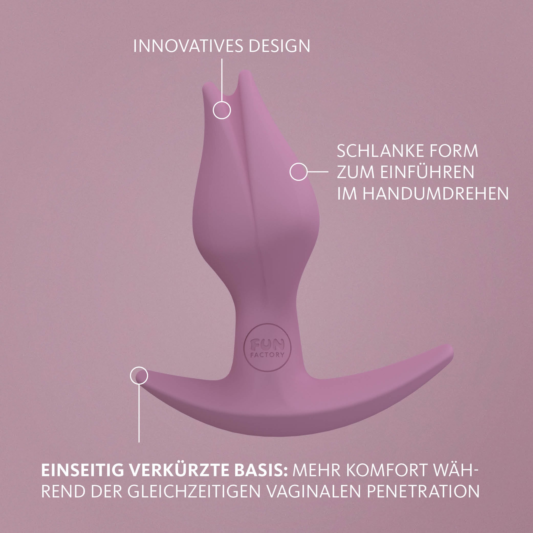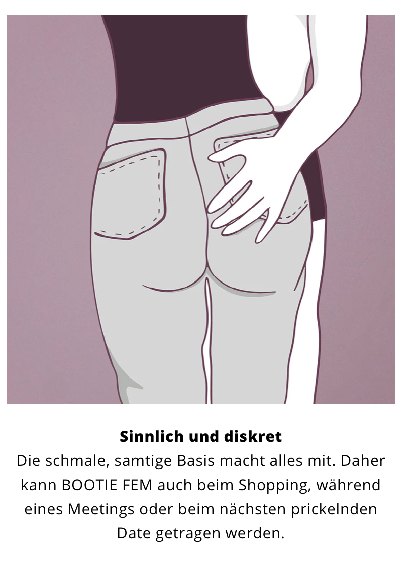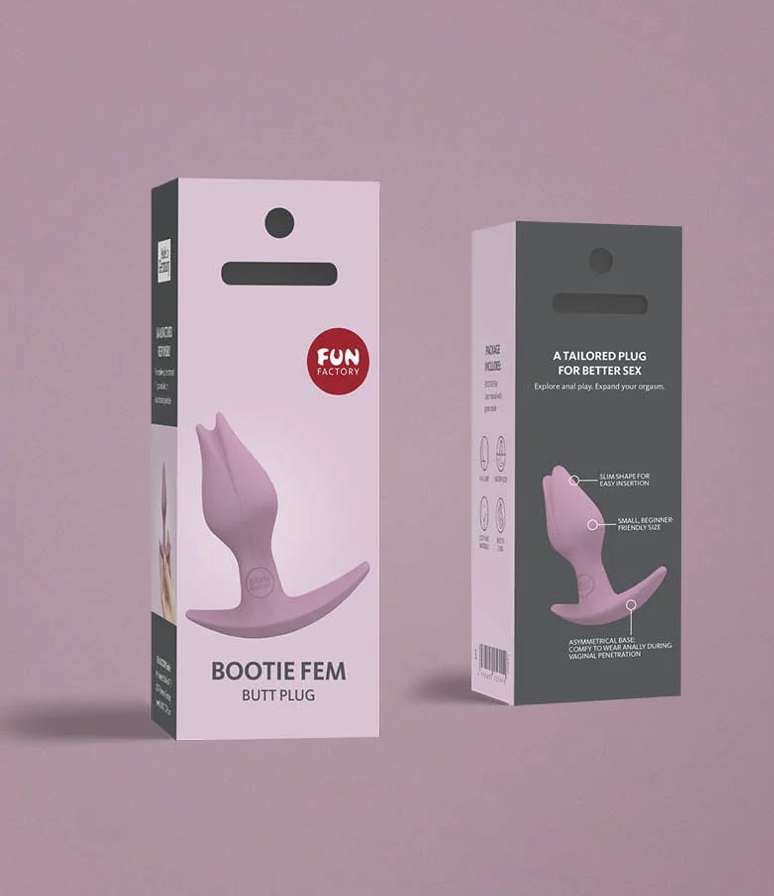Der Bootie Fem vom Fun Factory ist der perfekte Begleiter für die ersten Analspiele. Es handelt sich hier um einen Analplug, der perfekt auf die weibliche Anatomie abgestimmt wurde. Durch seine Form und der speziellen Wölbung stimuliert er die hinteren Wände der Vagina. Der leicht verkürzte Steg, der beim Tragen in Richtung Vagina zeigt, sorgt für ein erhöhtes Tragekomfort und ermöglicht auch das Tragen während dem Sex. Das ist nicht nur interessant für den Träger, sondern auch für den Gegenüber reizvoll, da durch das Tragen des Buttplug der Vaginalkanal verengt wird.