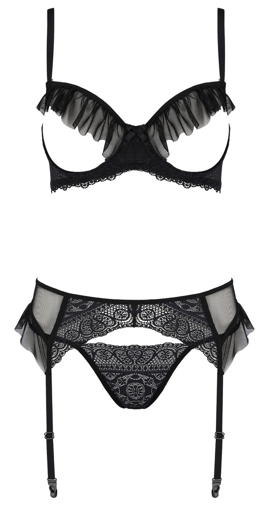 Bügel-BH, Strapsgurt und Riostring im Kerria set with open bra aus der Eco Collection von Passion. Alle drei Teile aus transparentem elastischem Powernet im Mix mit feiner fantasievoller Spitze. Bügel-BH mit offenen Cups und verspielten Volants, genauso wie der Strapsgurt. Beides mit Hakenverschluss im Rücken. Der Riosstring mit Spitzenfront hat seitlich nur schmale Stretchbänder. BH-Träger und Strumpfhalter sind für perfekte Passform in der Länge verstellbar.