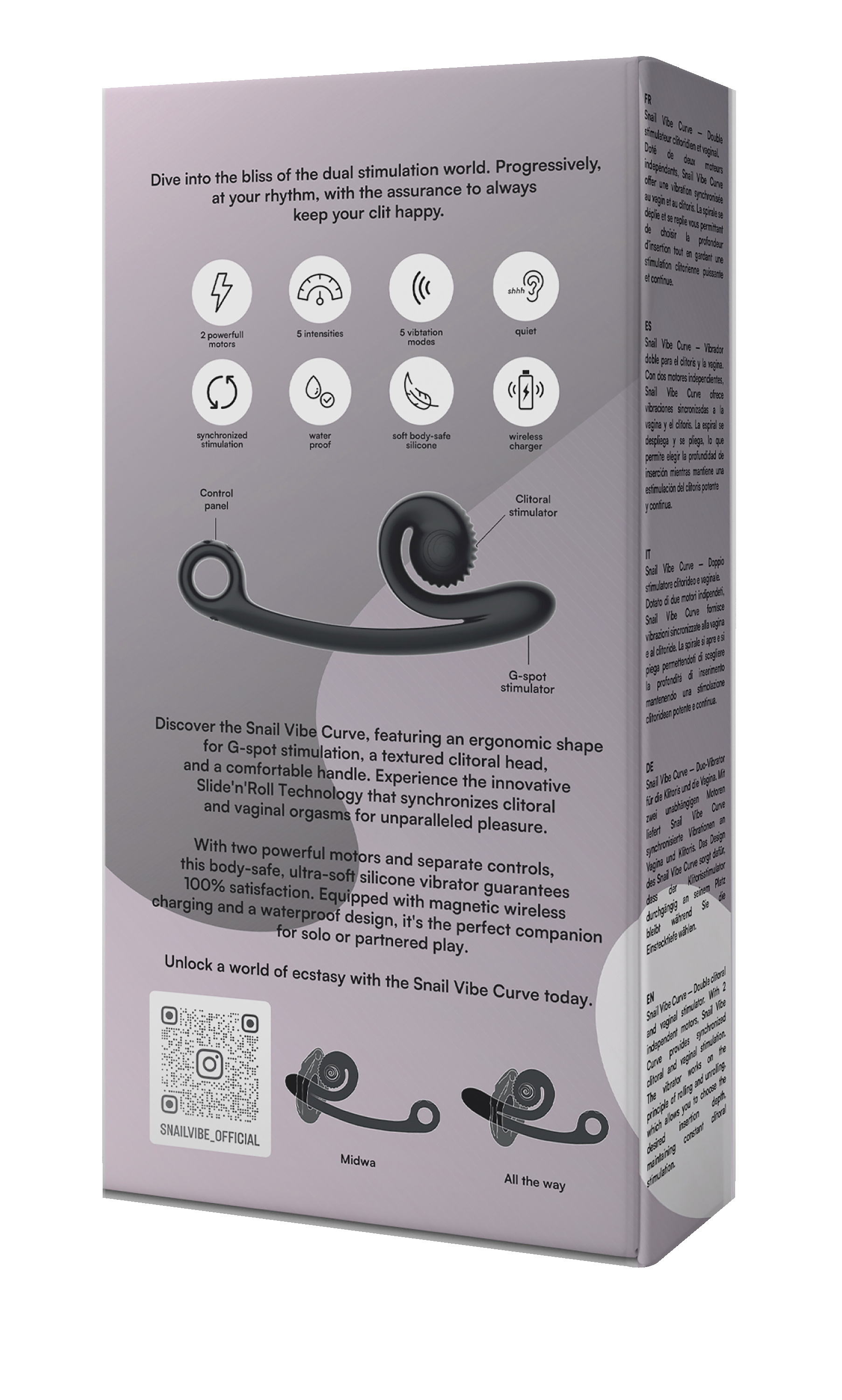 Perfekte G-Punkt-Stimulation: Mit seiner ideal gebogenen Form trifft der Snail Vibe Curve zielsicher auf Ihre G-Zone, um Ihnen noch intensivere Gefühle zu bescheren. Das bedeutet, dass Sie dual stimuliert werden und multiple Orgasmen in Reichweite haben.
