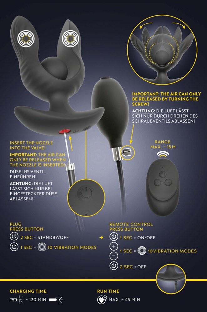 Der RC Inflatable Expander Plug with Vibration von ANOS sorgt für lustvolles Dehnen und intensive Tiefenstimulation. Die beiden flexiblen Plug-Arme werden zusammengedrückt eingeführt und anschließend über den aufpumpbaren Mittelball lustvoll auseinandergespreizt. Dank der griffigen Ballpumpe ist die Wunschgröße bequem erreichbar – das selbstschließende Ventil hält die Luft sicher im Plug.