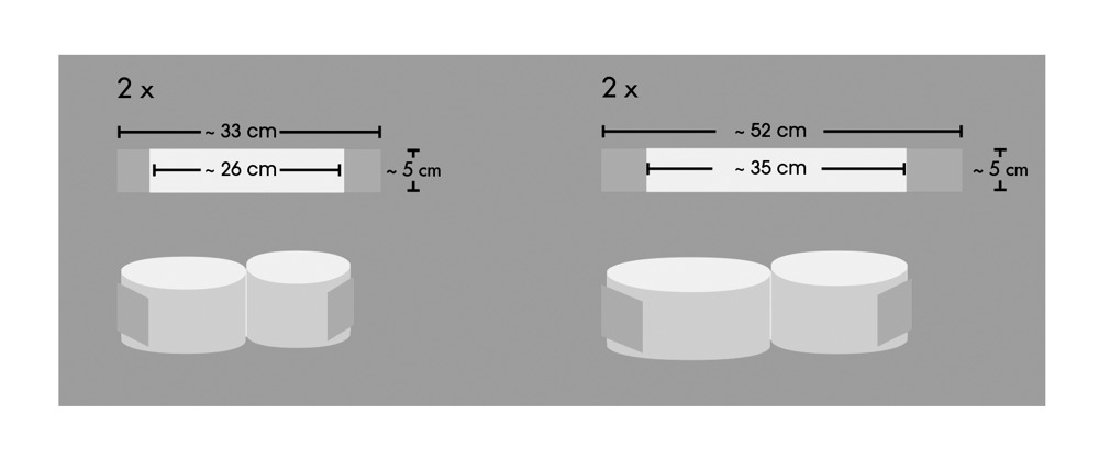 Alle Fesseln als Doppelband, 35 - 52 cm lang oder 26 -33 cm lang, 5 cm breit, schwarz, Polypropylen.