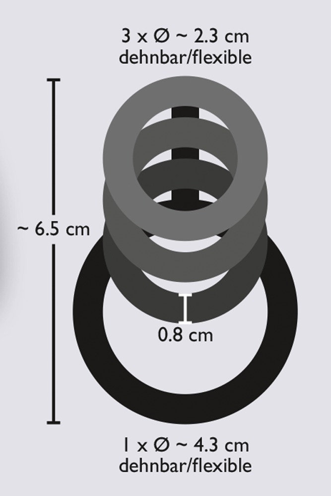 Penisringe-Quartett, verbunden mit einem gezackten Reizsteg. Ringdicke jeweils 8 mm. Ring-Ø 3 x 2,3 cm und 1 x 4,3 cm. Gesamtlänge 6,5 cm. Rauchschwarz.