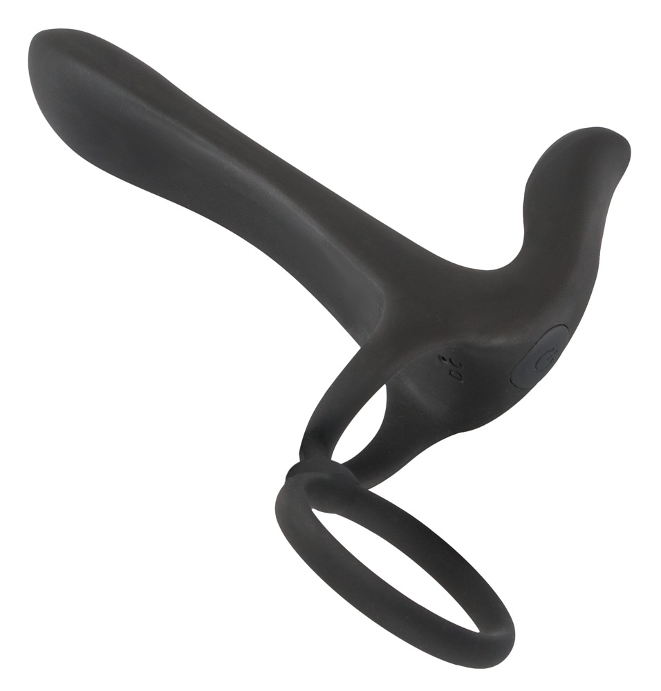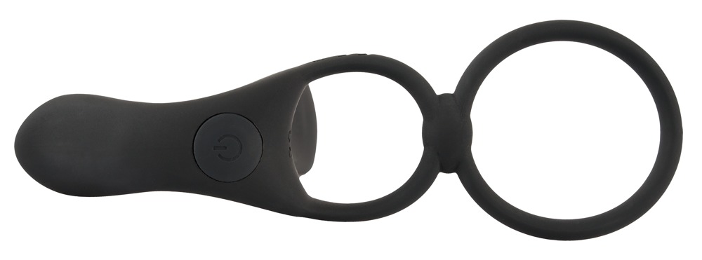 Penis-/Hodenring mit Vibrator und Vibro-Klitorisstimulator. Penis- und Hodenring werden umgelegt, sodass der Vibrator sich oben auf den Penis schmiegt.
