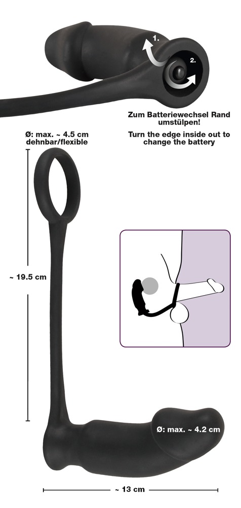 Vibro-Analplug 13 cm lang, Ø 3,9 cm bis 4,2 cm; Steglänge 14 cm; Ring-Ø 4,5 cm (dehnbar).