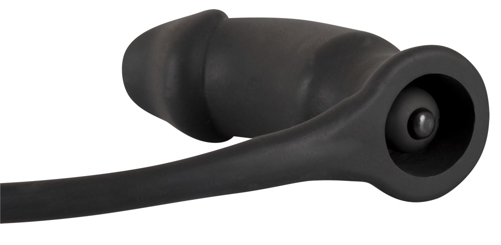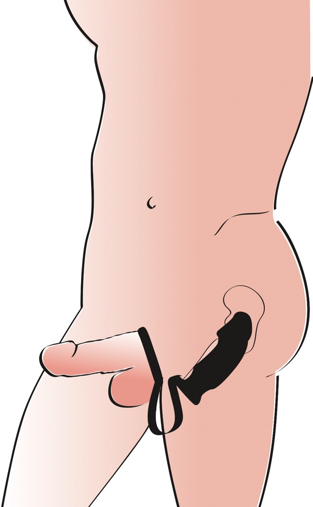 Dehnbarer Penis-/Hodenring mit flexiblen Verbindungssteg und fest arretiertem Vibro-Analplug im Penislook.