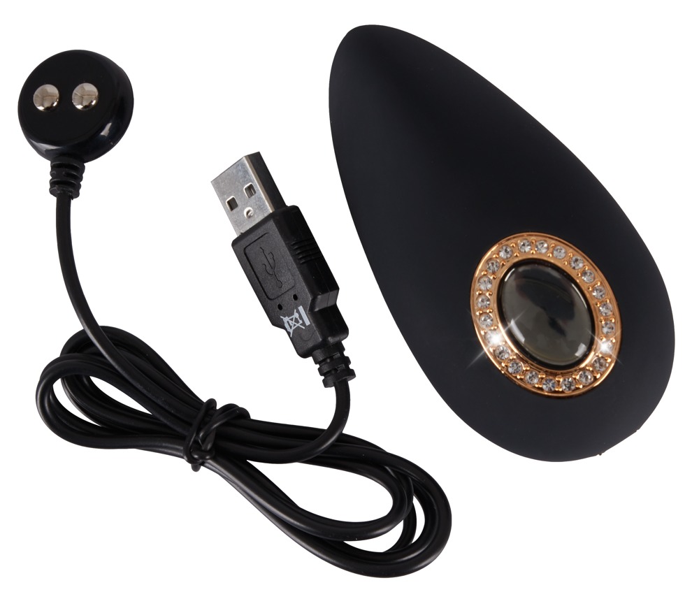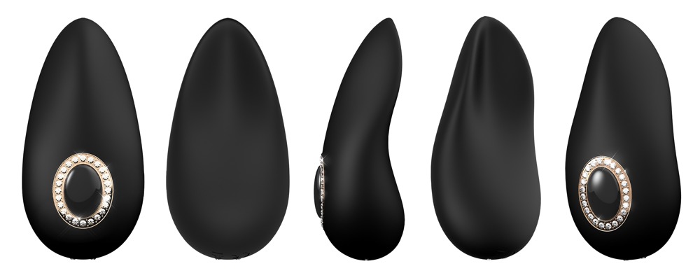 Ergonomisch geformter Auflegevibrator mit seidig weicher Textur in mystischem Design mit edlen Schmucksteinen und dekorativem Knopf in Spiegel-Optik.
