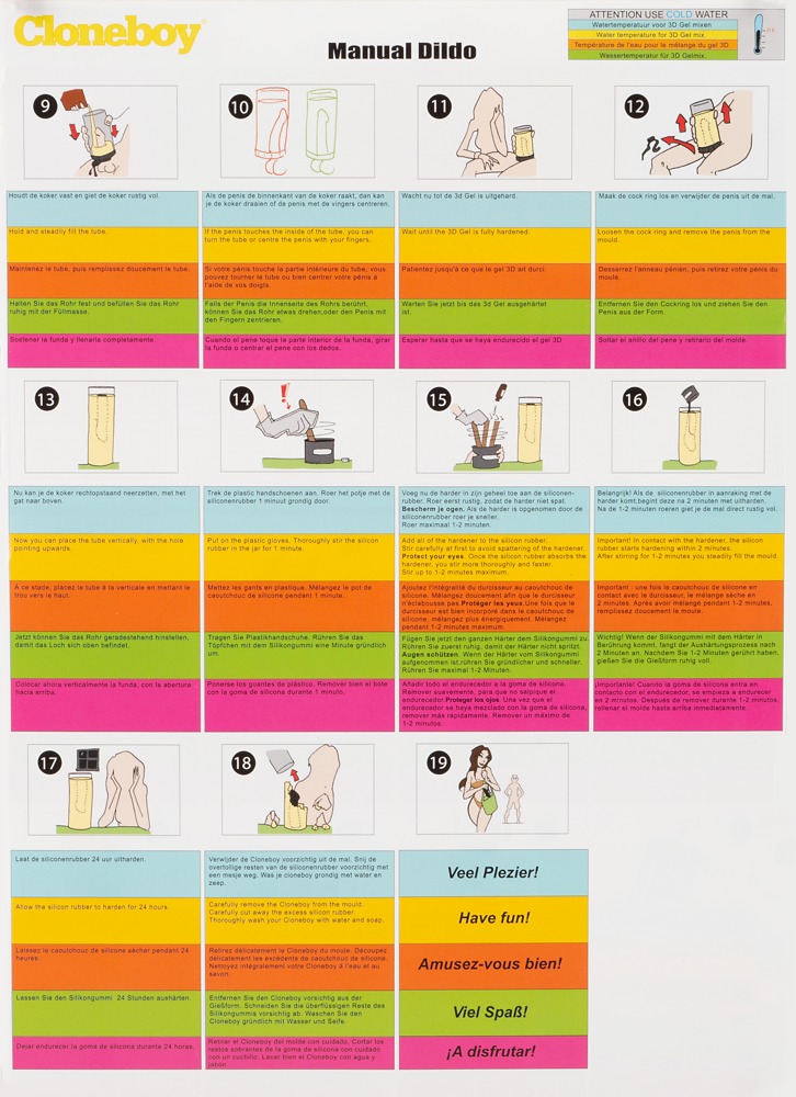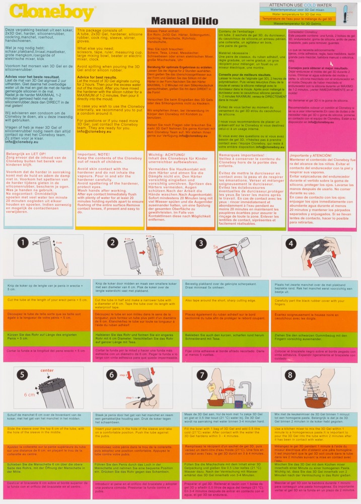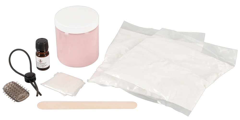 Set bestehend aus (die Umverpackung des Sets dient als) Gussform, Penis-Zurrgurt, Manschette, Fläschchen mit Härter, 3-D-Gel zum Erstellen von 2 Abdrücken (falls der erste Abdruck nicht gelingt), Silikongummi, 1 Paar Plastikhandschuhe, Holzspatel, ausführliche Gebrauchsanweisung (D, NL, FR, GB).