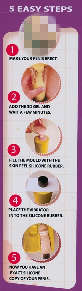 Machen Sie sich Ihren eigenen Vibrator nach dem originalen Abdruck von Ihrem Penis. Kit besteht aus: 1 Köcher aus Karton, Cockring, Vibrator, Zentrier-Keil, 3D Gel, hautfarbende Silikonflüssigkeit, Härter, Manschette, Rührstock, 1 Paar Plastikhandschuhe, Gebrauchsanweisung.