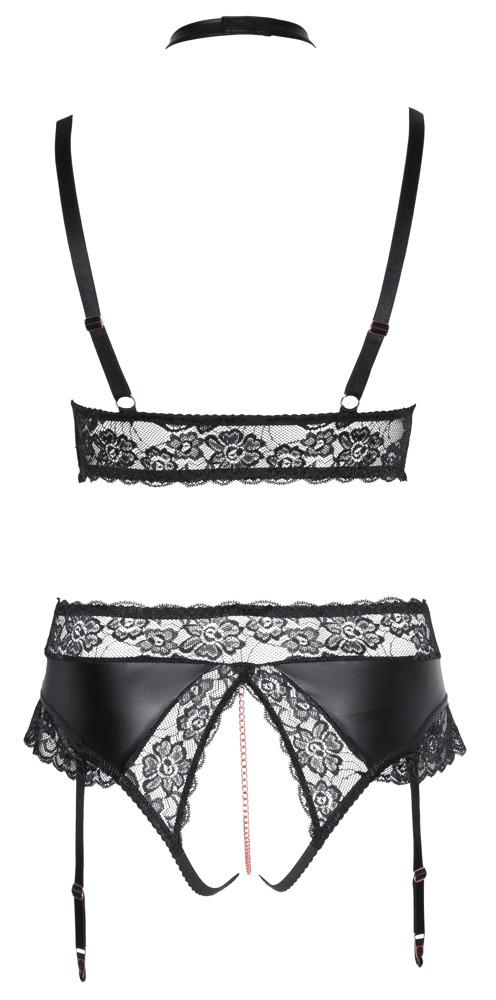 - Schnitt & Material: Soft-BH und Straps-Slip ouvert im Mix aus Mattlook mit weicher elastischer Spitze und roségoldfarbenen Elementen. BH mit Dekolleté-Ketten, die vom Halsband (mit Klettverschluss) und dem BH abnehmbar sind. Slip im Schritt bis über den Po offen, mit stimulierender Schrittkette. Verstellbare Strumpfhalter vom Slip abnehmbar. 90% Polyester, 10% Elasthan; Spitze 90% Polyamid, 10% Elasthan.