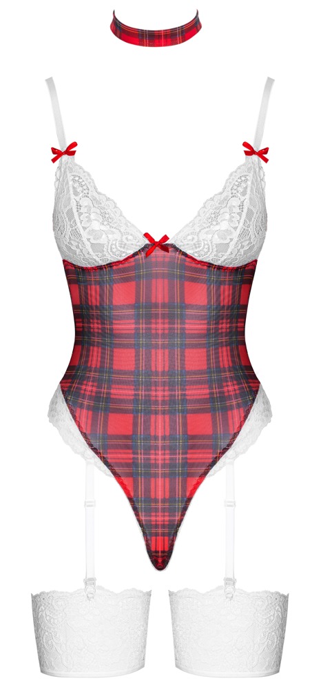Verspielter Schulmädchen-Style für reizvolle Rollenspiele: Das 2-teilige Dessous-Set von Cottelli LINGERIE besteht aus einem Straps-Body im klassischen Karo-Look und einem passenden Halsband. Weiße Spitze, rote Schleifen und elastisches Material sorgen für eine reizvolle Optik und hohen Tragekomfort. Die abnehmbaren Strapse mit breiten Strumpfbändern sowie der praktische Schrittverschluss runden die Ausstattung ab – ideal für stilvolle Verführung mit durchdachten Details.