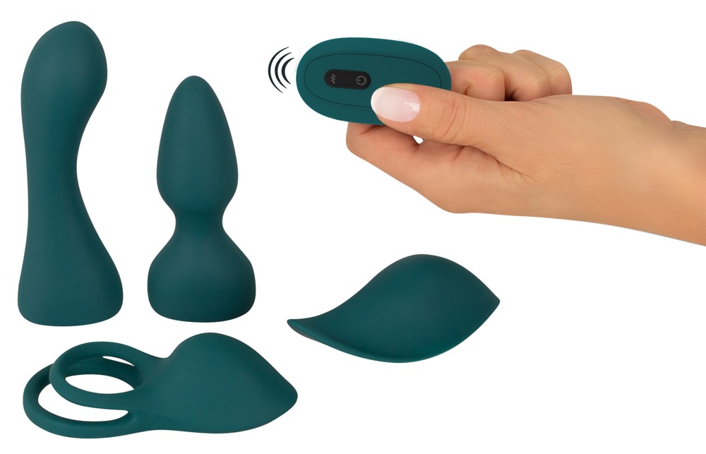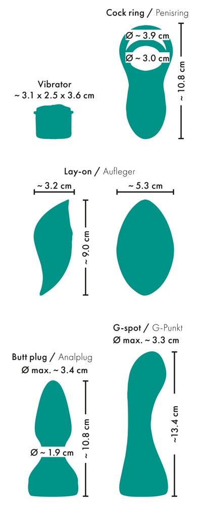 - Das Set enthält einen G-Punkt-Dildo, einen Analplug, einen Auflege-Stimulator sowie einen Penis-/Hodenring mit Klitoris-Stimulator