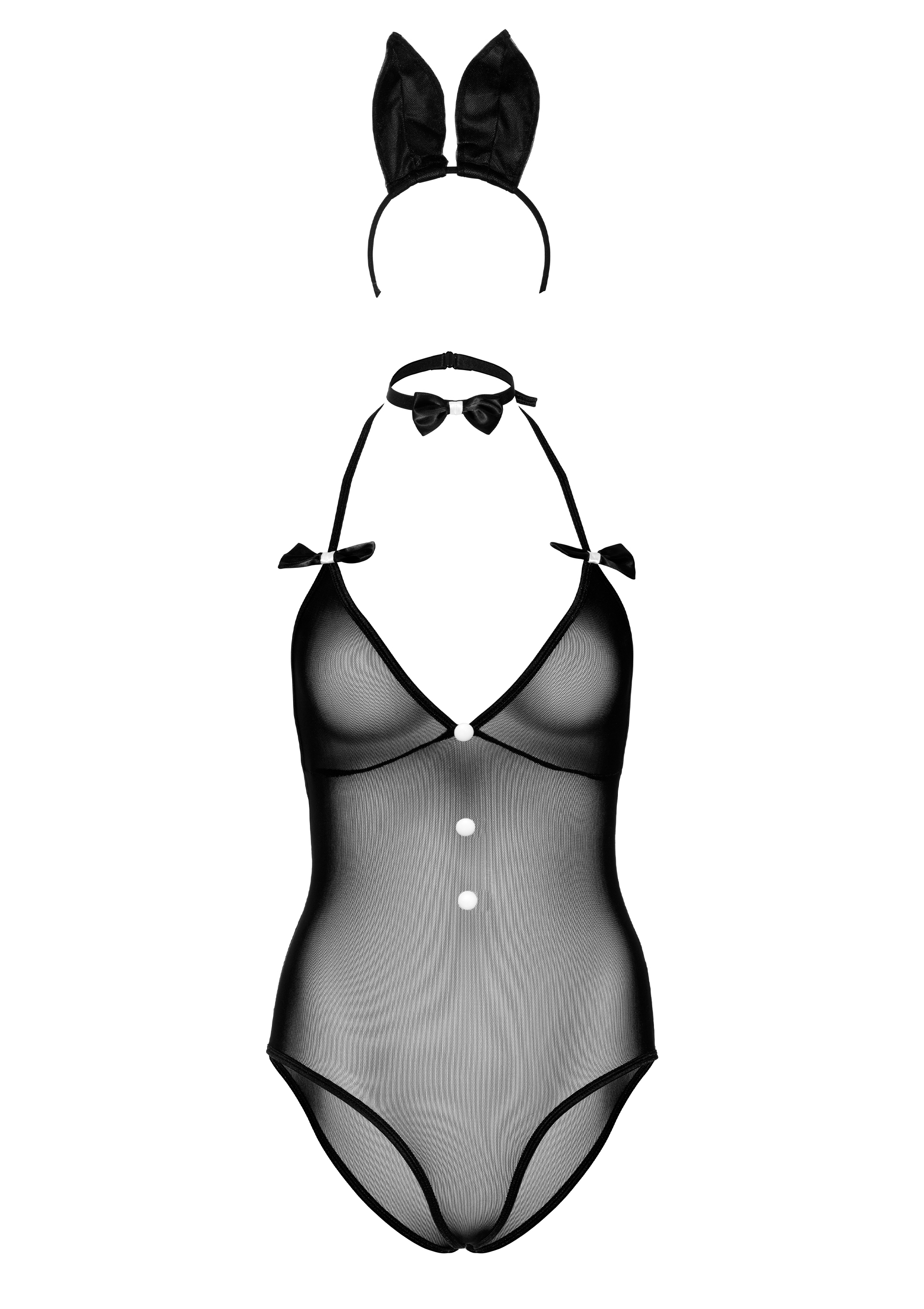 Klassisches Hasen-Rollenspiel-Set - Play-Bunny-Rollenspiel-Set, inklusive Neckholder-Body aus weichem transluzentem Mesh mit Schleifendetails und Knöpfen in Smoking-Optik. Inklusive elastischem Kragen mit Fliege und Hasenohren.