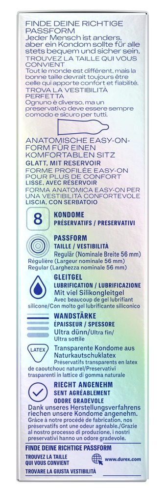 Die dünnsten Kondome von Durex bekommst du mit den Durex Hautnah Extra Feucht geliefert, die eine große Passform (nominale Breite 60mm) bieten. Die transparenten Naturlatexkondome sind ultra zart und mit extra viel Silikongleitgel befeuchtet. Die dünne Wandstärke ermöglicht ein besonderes intesnsives Sexerlebnis. In anatomischer Easy-on-Form mit Reservoir.