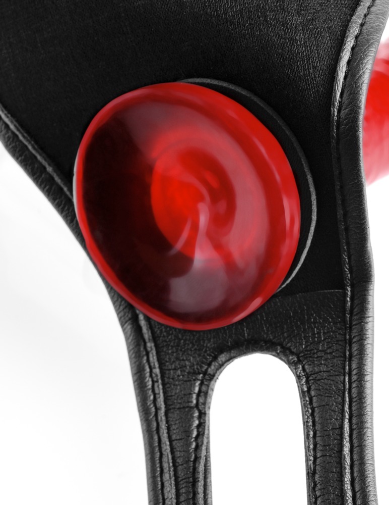 String ouvert in Leder-Optik mit verstärkter Front-Öffnung, in die ein Dildo/Vibrator mit Saug-/Standfuß (nicht im Lieferumfang enthalten) eingesetzt werden kann.