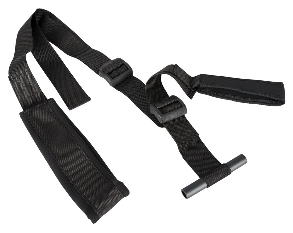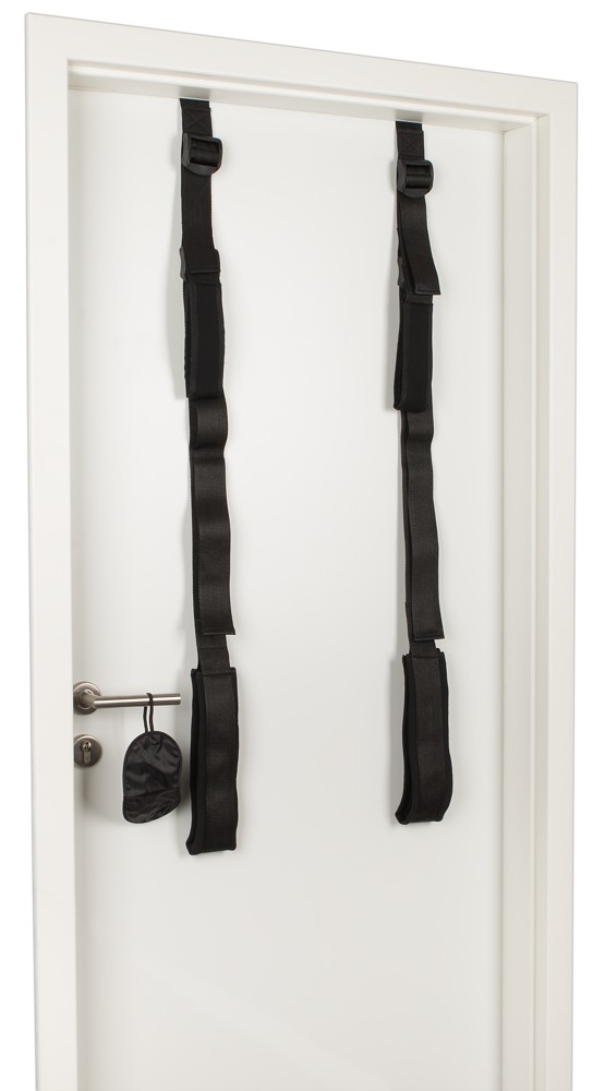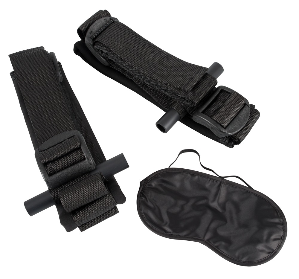 Bestehend aus zwei schwarzen, mehrfach verstellbaren Gurten mit Schlaufen für Arme und Beine an zwei Acrylstangen.