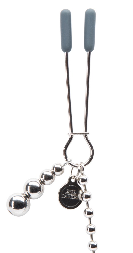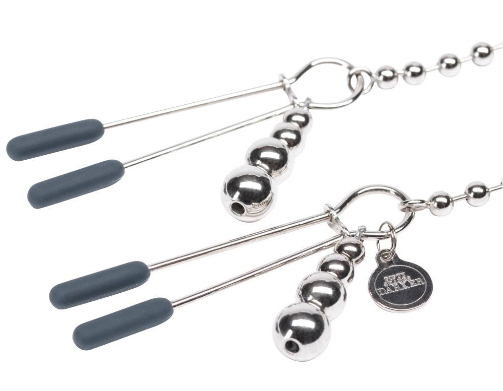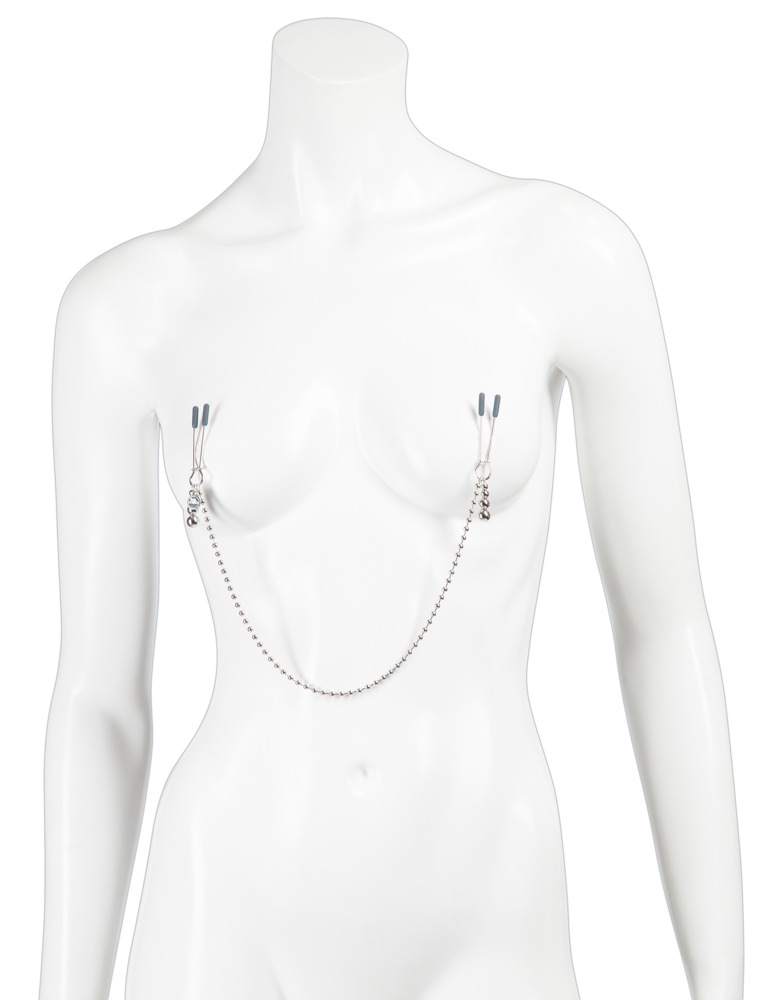 Diese silberne Brustklemmenkette mit den Kugelketten an beiden Seiten ist das ideale Accessoire für Busen, denn so ist alle Aufmerksamkeit sicher. Die gewünschte Druckintensität kann ganz einfach per Schiebereing eingestellt werden für angenehmen oder intensiveren Tragekomfort, der zusätzlich durch den schwarzen Silikonüberzug erhöht wird.Die Verbindungskette ermöglicht interessante Stimulationsspiele. Inklusive Satin-Aufbewahrungsbeutel.
