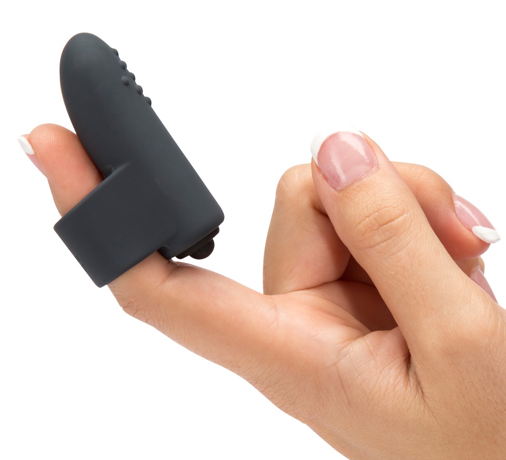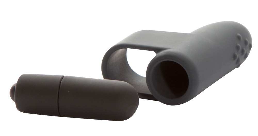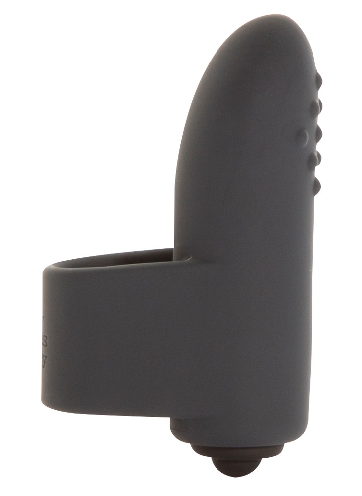Kleiner Vibrator mit genoppter Auflegefläche und Fingerschlaufe. Grau. Ca. 6 cm lang, Ø Ring 1,5 cm. Material: Silikon. Inklusive Batterien.
