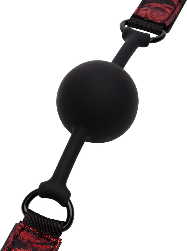 Silikon-Knebel Sweet Anticipation Ball Gag von Fifty Shades of Grey mit beidseitig tragbarem Kopfband. Eine Seite in schwarzer Lederoptik, andere Seite mit Satin im schwarz/roten Rosendesign. Komfortabel gepolstertes Kopfband mit Klettverschluss passend verstellbar.