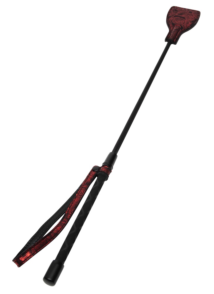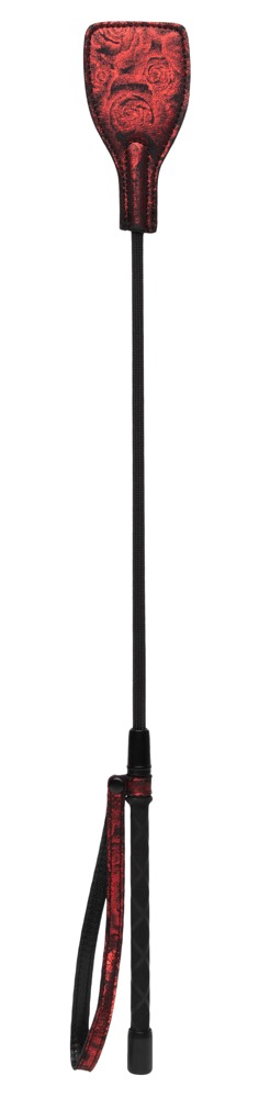 Hochwertige Gerte Sweet Anticipation Riding Crop von Fifty Shades of Grey mit unterschiedlichen Schlagseiten: Eine Seite in schwarzer, rau strukturierter Lederoptik, andere Seite mit glattem Satin im schwarz/roten Rosendesign. Stabiler langer Griff mit Hand-/Aufhängeschlaufe für kontrollierten Schwung beim lustvollen Schlagen.