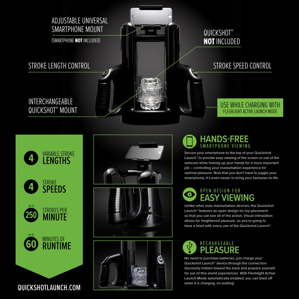 Erleben Sie eine völlig neue Dimension der Selbstbefriedigung mit dem Quickshot Launch, einem vollautomatischen Masturbator-Adapter, der speziell für die Verwendung mit jedem Quickshot von Fleshlight entwickelt wurde. Hier sind die Highlights: