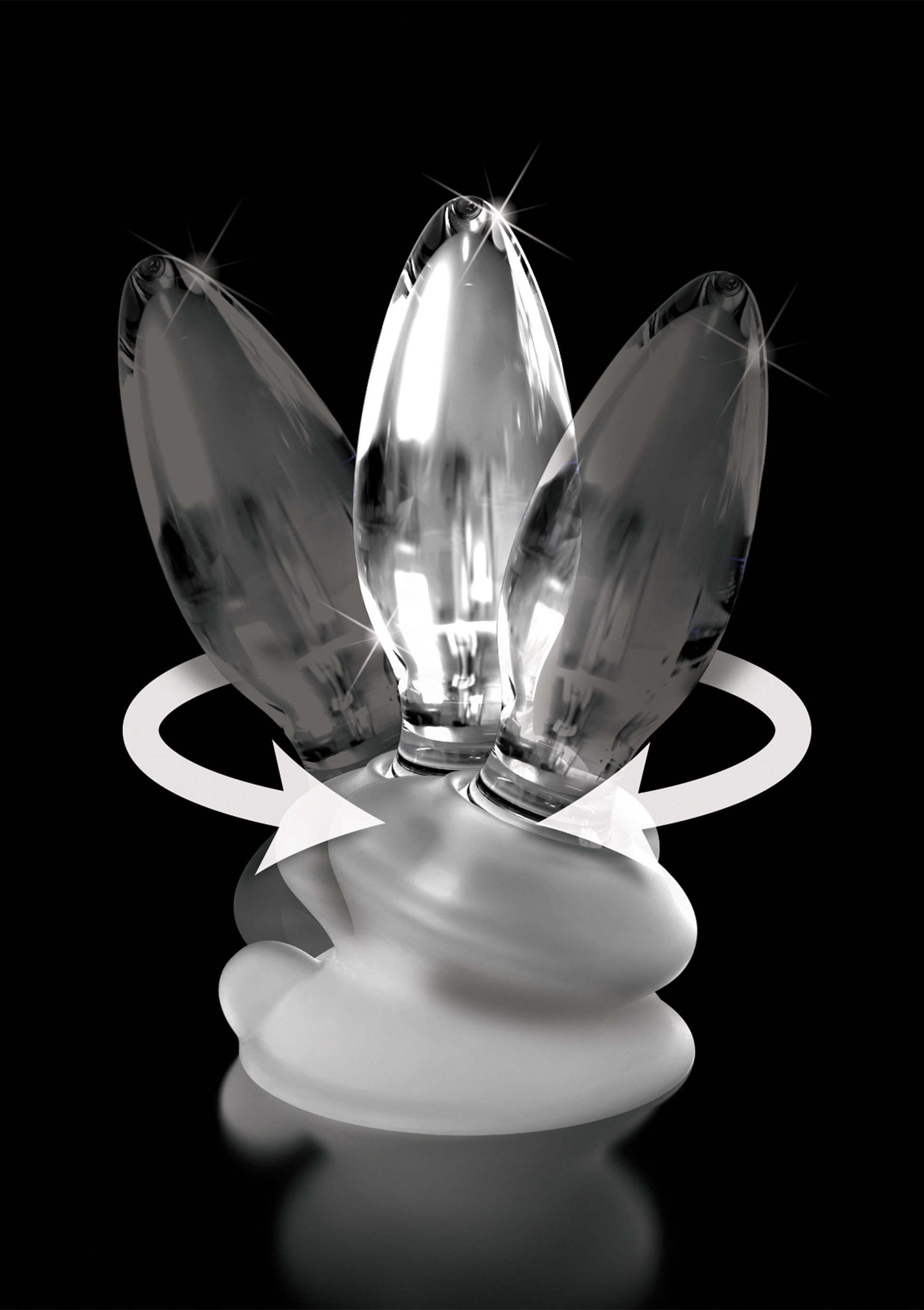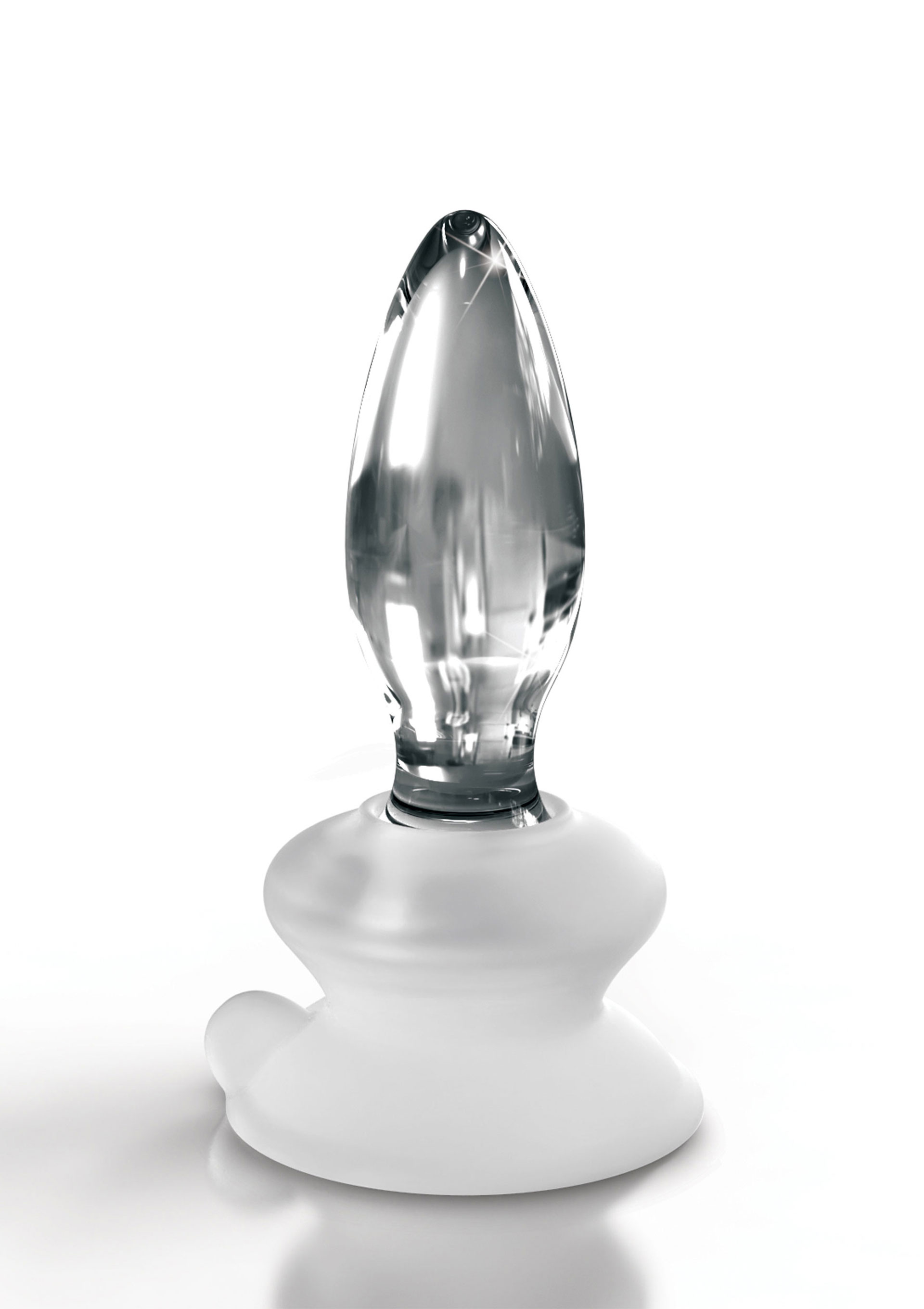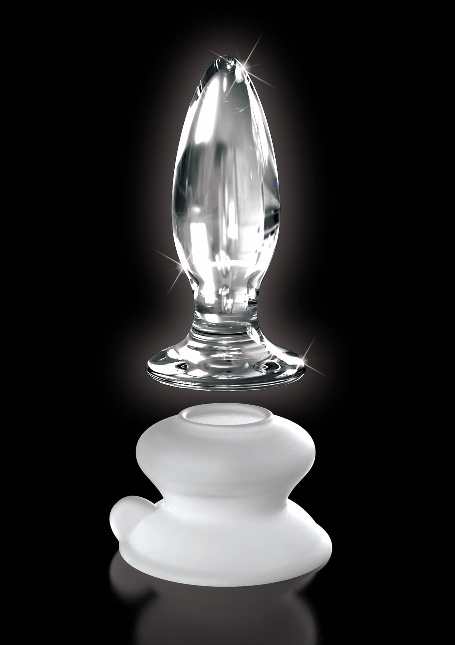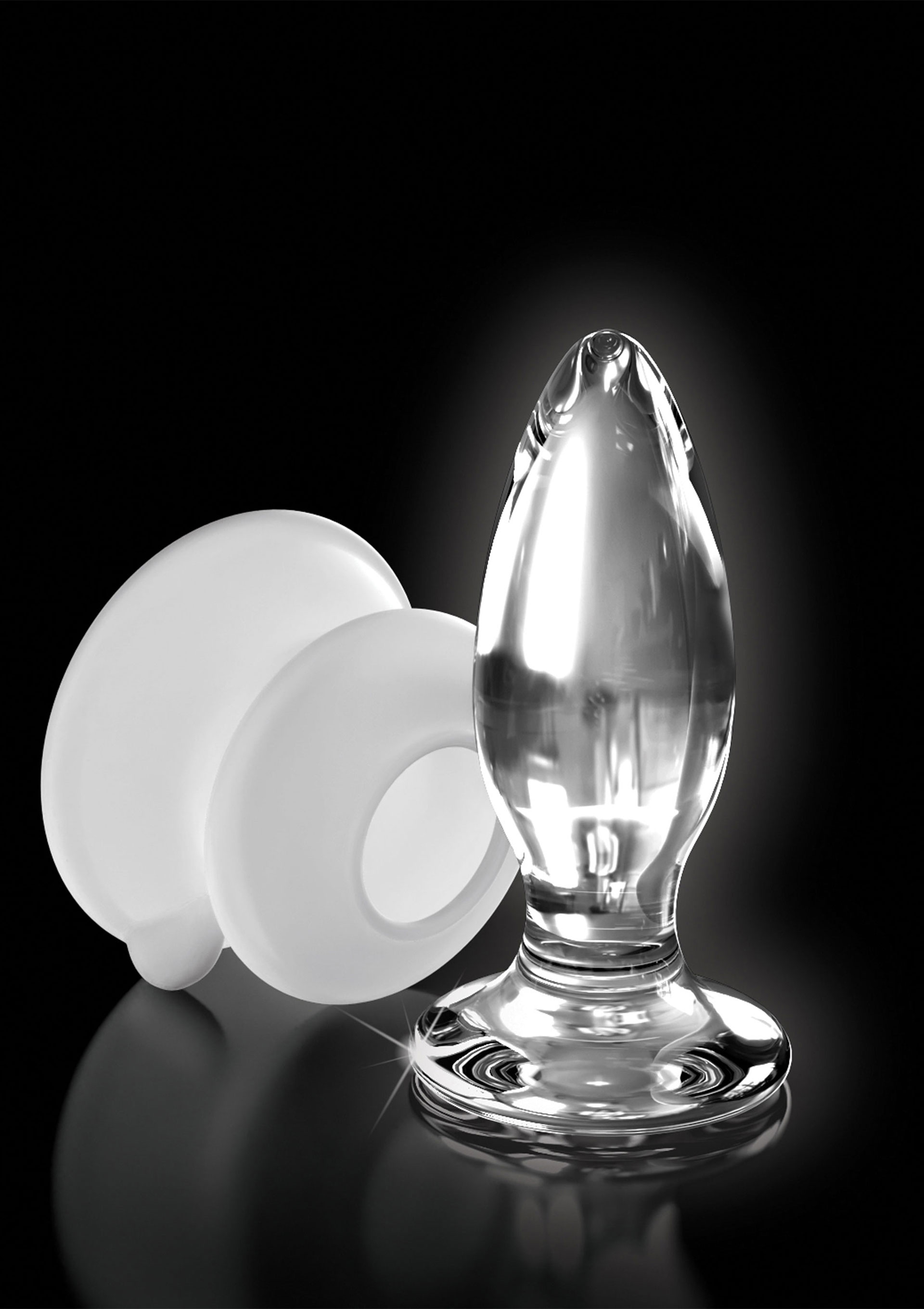 Gesamtlänge 10 cm, Einführlänge 8,5 cm, Ø max. 3,5 cm; Saugfuß 4,4 cm hoch, Ø 7 cm. Glas, Silikon.