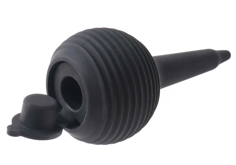 Der Pumpball wird einfach befüllt und am Schaftende eingeführt. Auf Druck katapultiert er dann die auserwählte Flüssigkeit aus der Eichel.