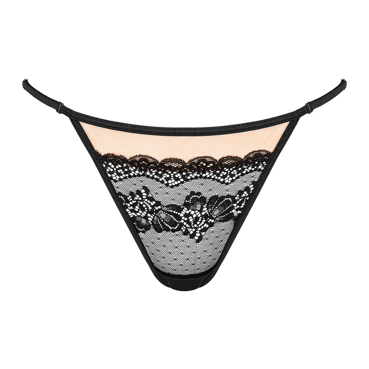 Farblicher Kontrast: Der besondere Reiz dieses Strings liegt im aufregenden Kontrast zwischen beigem Tüll und schwarzer Spitze. Ein visuelles Statement, das deine Sinnlichkeit unterstreicht.