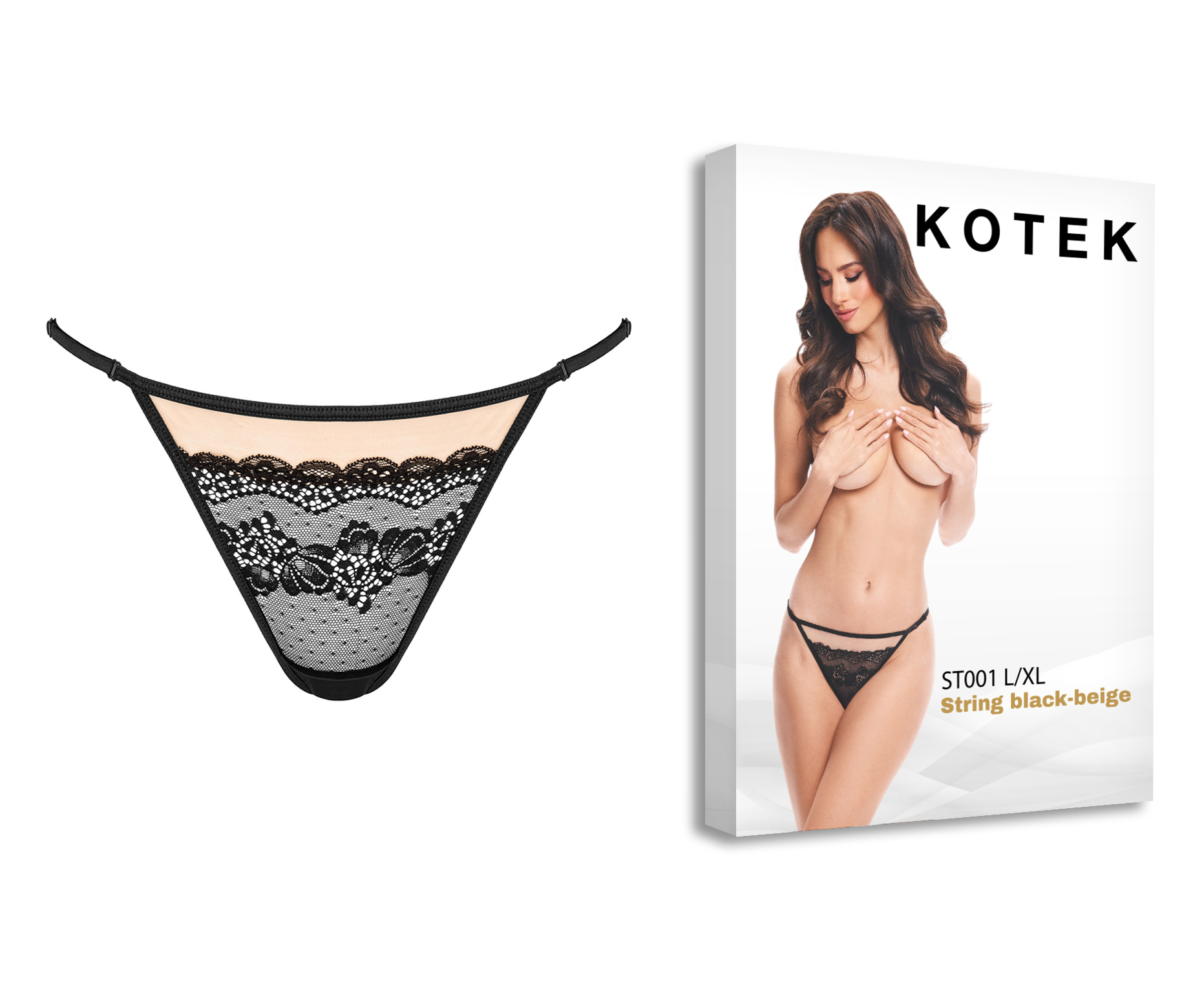 Entdecke die Verlockung des Spitzenstrings ST001 von KOTEK, der aus einer Kombination von sanften Tüll und zarter Spitze gefertigt ist. Ein Hauch von Sinnlichkeit für deine intimen Momente.