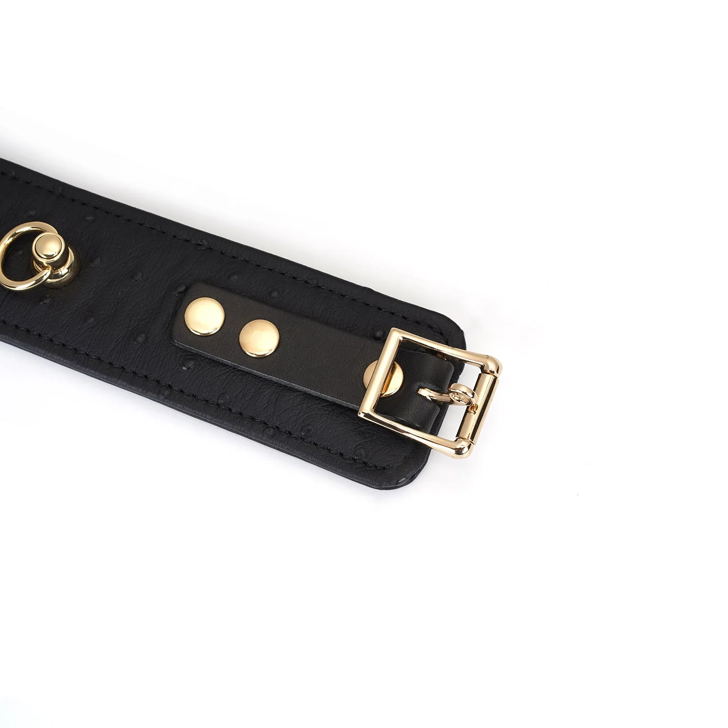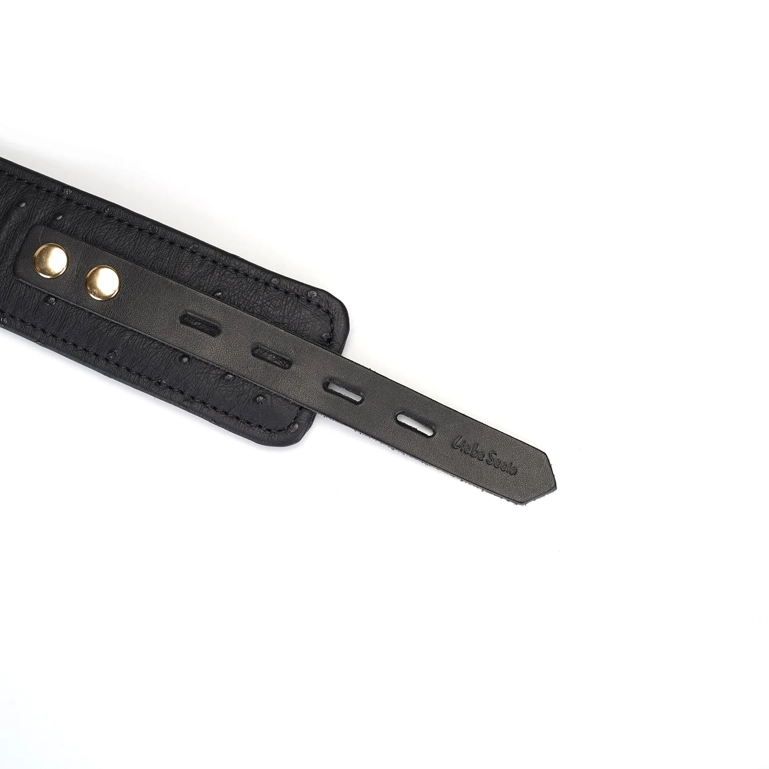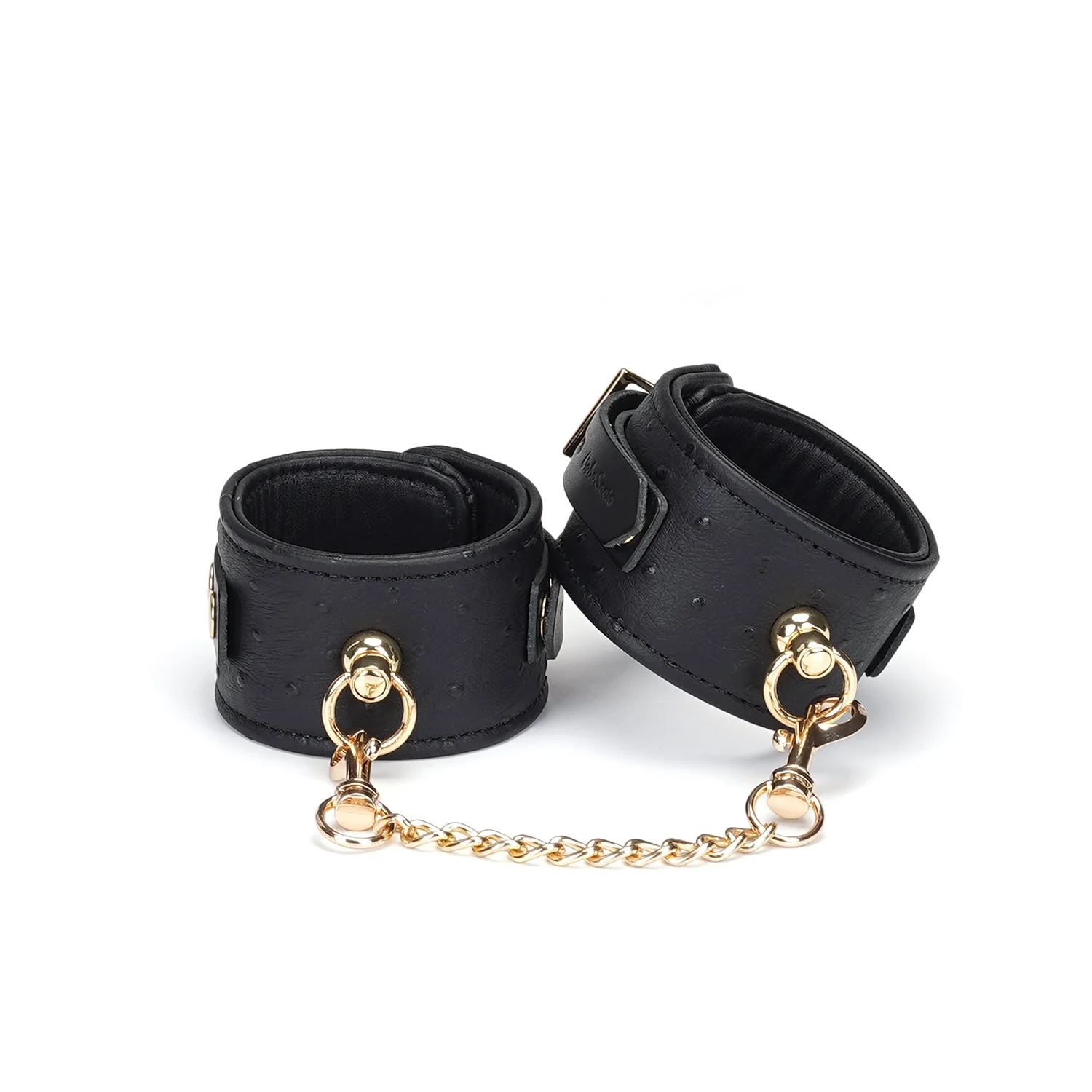 Erlebe sinnliche Fessel-Spiele mit den luxuriösen Handfesseln aus schwarzem Leder in Straußenhautmuster aus der Serie Demon's Kiss von Liebe Seele!