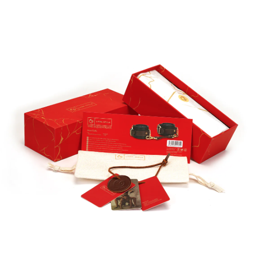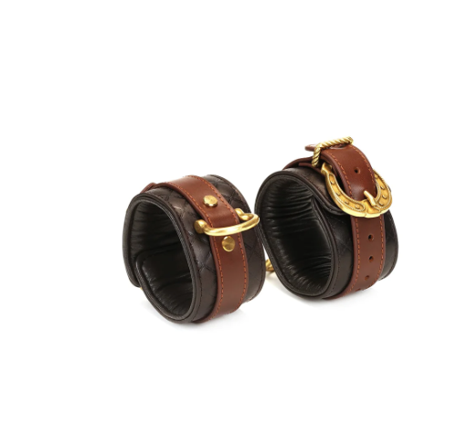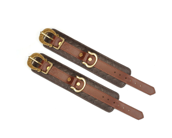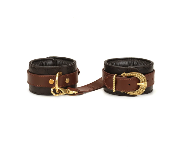 Die Armfesseln sind aus echtem Rindsleder in zwei Farben und Texturen handgefertigt, ein reich gepolstertes Inneres, das mit Lammleder gefüttert ist, um Komfort zu gewährleisten und mit den charakteristischen Hardware-Akzenten von The Equestrian in Nugget-Gold verziert ist.