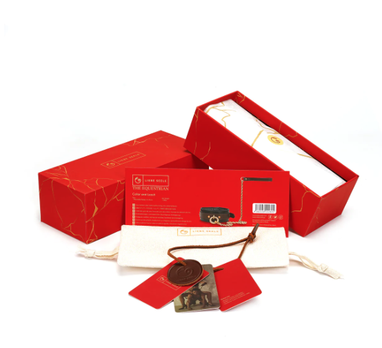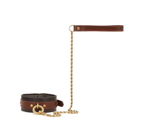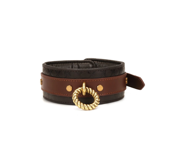 Das Halsband ist aus echtem Rindsleder in zwei Farben und Texturen handgefertigt, ein reich gepolstertes Inneres, das mit Lammleder gefüttert ist, um Komfort zu gewährleisten und mit den charakteristischen Hardware-Akzenten von The Equestrian in Nugget-Gold verziert ist.