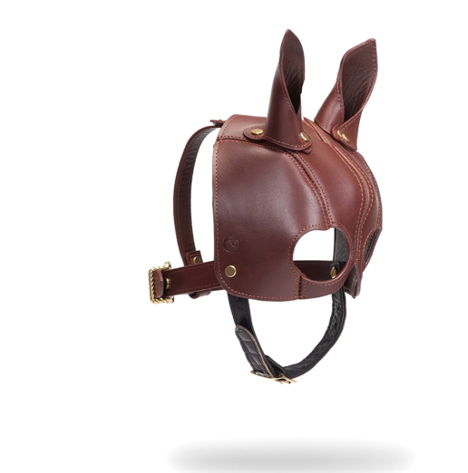 Die Maske ist aus echtem Rindsleder in zwei Farben und Texturen handgefertigt, ein reich gepolstertes Inneres, das mit Lammleder gefüttert ist, um Komfort zu gewährleisten und mit den charakteristischen Hardware-Akzenten von The Equestrian in Nugget-Gold verziert ist.