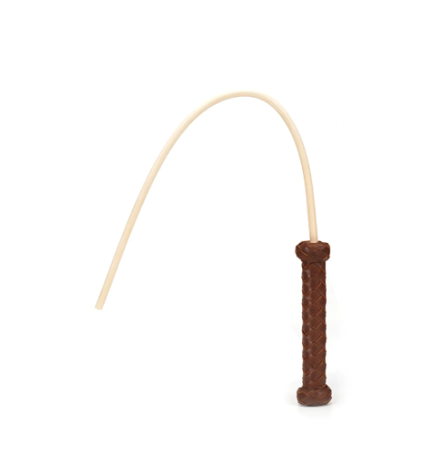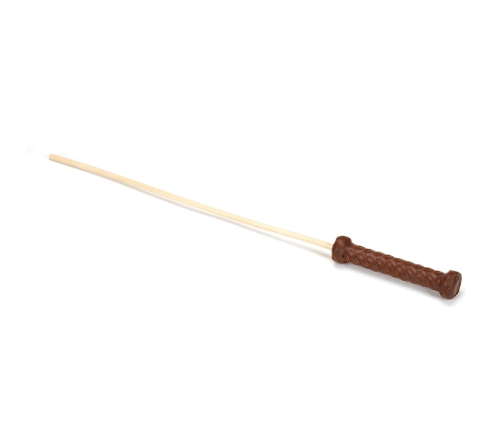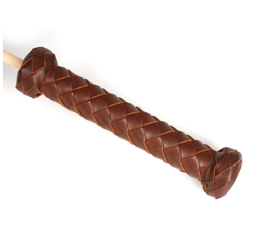Der Rohrstock hat einem Holzgriff der mit handgeflochtenem, echtem Rindsleder umwickelt ist.
