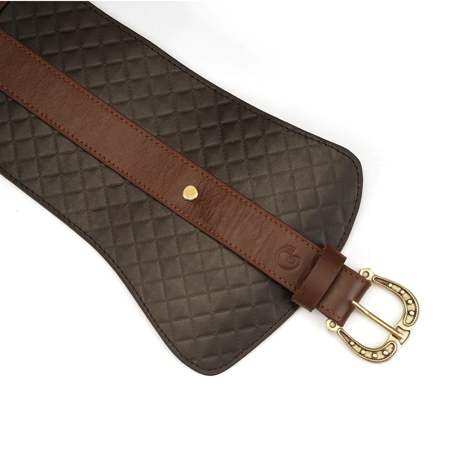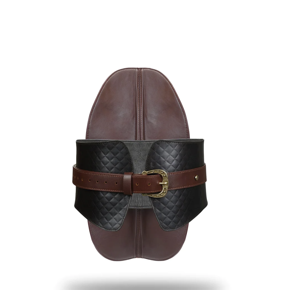 Die Maske ist aus echtem Rindsleder in zwei Farben und Texturen handgefertigt, ein reich gepolstertes Inneres, das mit Lammleder gefüttert ist, um Komfort zu gewährleisten und mit den charakteristischen Hardware-Akzenten von The Equestrian in Nugget-Gold verziert ist.
