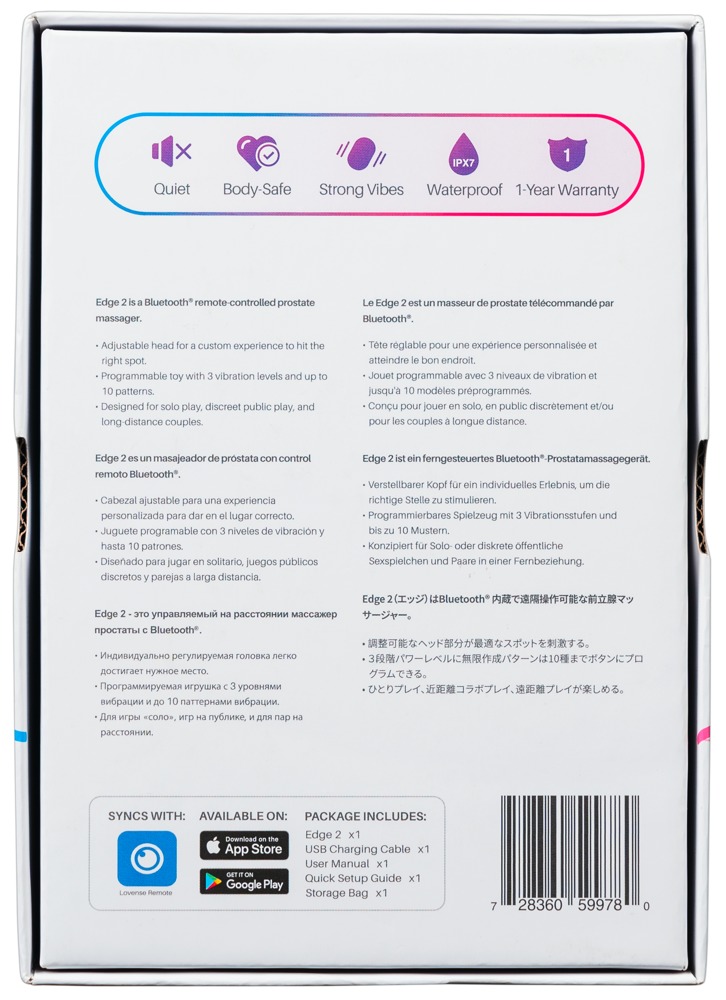 Steuerbar ist der Edge 2 direkt am Toy oder ganz bequem per Lovense App. Dort lassen sich eigene Vibrationsmuster kreieren, speichern und unbegrenzt kombinieren – auch für Partner-Control über große Entfernungen. Zusätzlich können die Vibrationen über Musik-Rhythmen oder Geräusche aktiviert werden. Dank Wasserdichtigkeit eignet sich der Edge 2 auch für die Dusche oder das Bad.