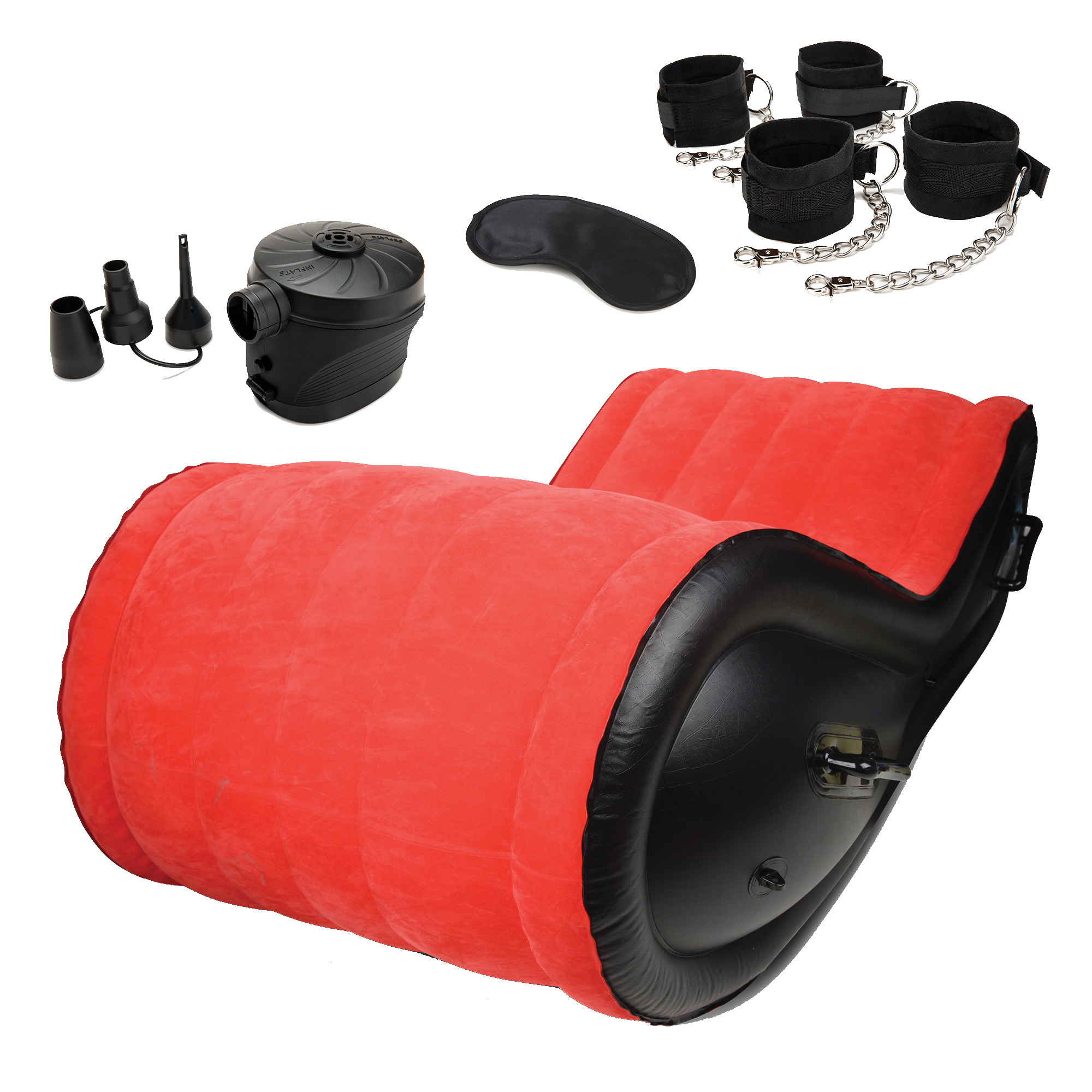 Das 6-teilige aufblasbare BDSM-Sex-Sofa-Set bietet alles, was Sie brauchen, um das Spiel von Paaren mit versauten Bondage-Spielen zu verbessern, und ein vielseitiges Möbelstück, mit dem Sie Sex in aufregenden neuen Positionen ausprobieren können. In einer erotischen Farbkombination aus Rot und Schwarz lockt dieses aufblasbare Bett mit seinen sinnlichen Rundungen auf seine samtweiche Oberfläche. Entdecken Sie die angenehme Befriedigung, mit dem mitgelieferten Set an Hand- und Fußfesseln mit Fesselspiel zu experimentieren.