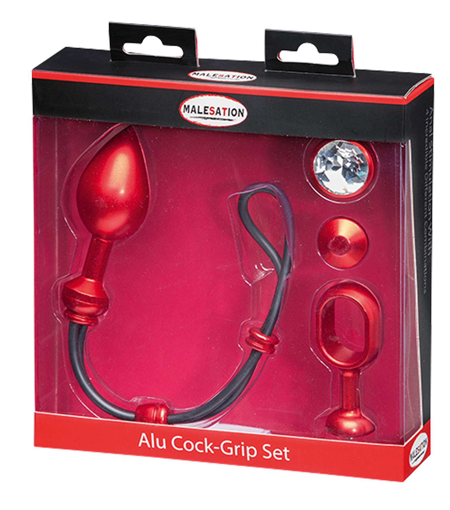 Durch die intelligente Schraubkonstruktion kann der Plug mit den verschiedenen Zubehörteilen, die im Set enthalten sind, verwendet werden. Einfach den Cock-Grip abschrauben und eines der Zubehörteile aufschrauben. 4 verschiedene Kombinationsmöglichkeiten in einem Set - Alu-Plug mit Cock-Grip, Alu-Plug mit Stoßgriff, Alu-Plug mit Schmuckstein oder Cock-Grip mit Endkappe als Penis-/ Hodenring.