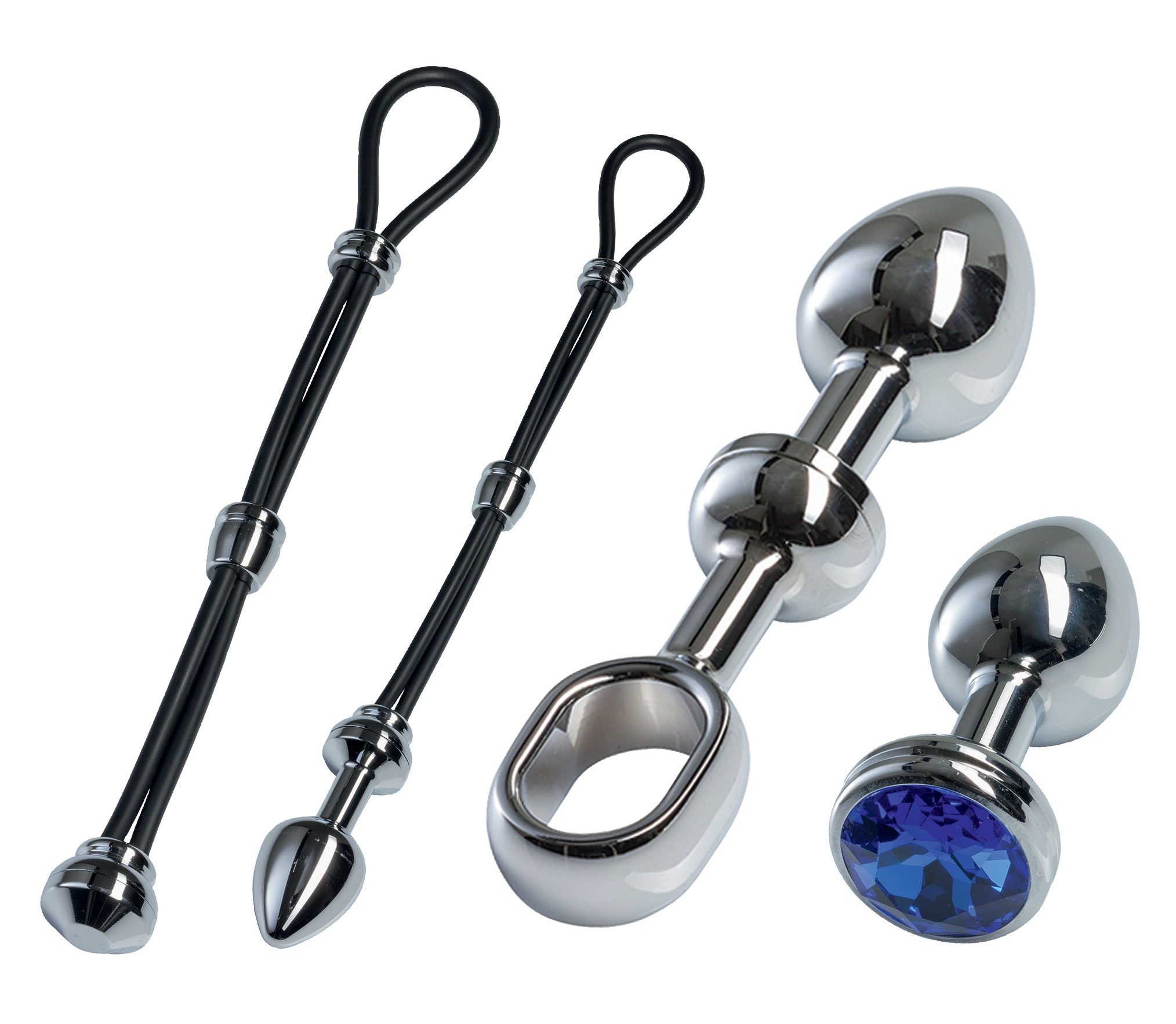Set bestehend aus Plug, Stoßgriff, Endkappe, Schmuckstein und Cock-Grip. Durch die intelligente Schraubkonstruktion kann der Plug mit den verschiedenen Zubehörteilen, die im Set enthalten sind, verwendet werden. Einfach den Cock-Grip abschrauben und eines der Zubehörteile aufschrauben. 4 verschiedene Kombinationsmöglichkeiten in einem Set - Alu-Plug mit Cock-Grip, Alu-Plug mit Stoßgriff, Alu-Plug mit Schmuckstein oder Cock-Grip mit Endkappe als Penis-/ Hodenring.