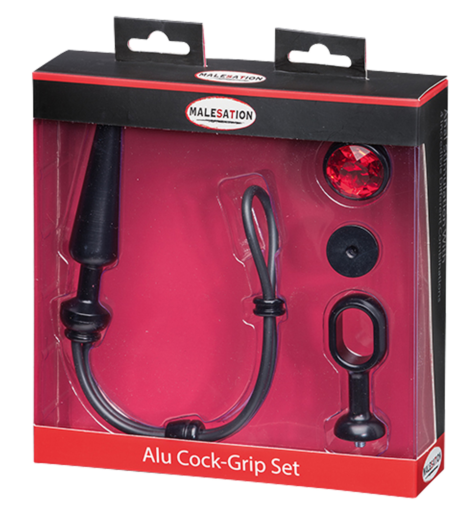 Set bestehend aus Plug, Stoßgriff, Endkappe, Schmuckstein und Cock-Grip. Durch die intelligente Schraubkonstruktion kann der Plug mit den verschiedenen Zubehörteilen, die im Set enthalten sind, verwendet werden. Einfach den Cock-Grip abschrauben und eines der Zubehörteile aufschrauben. 4 verschiedene Kombinationsmöglichkeiten in einem Set - Alu-Plug mit Cock-Grip, Alu-Plug mit Stoßgriff, Alu-Plug mit Schmuckstein oder Cock-Grip mit Endkappe als Penis-/ Hodenring.