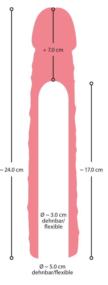 Verlängert Dein bestes Stück um 7 cm und vergrößert den Umfang um 2 cm. Die Eichel und der Schaft sind auseprägt und geädert. Sitzt eng und rutschfest an Deinem Penis und unterstützt damit wirkungsvoll die Erektion.