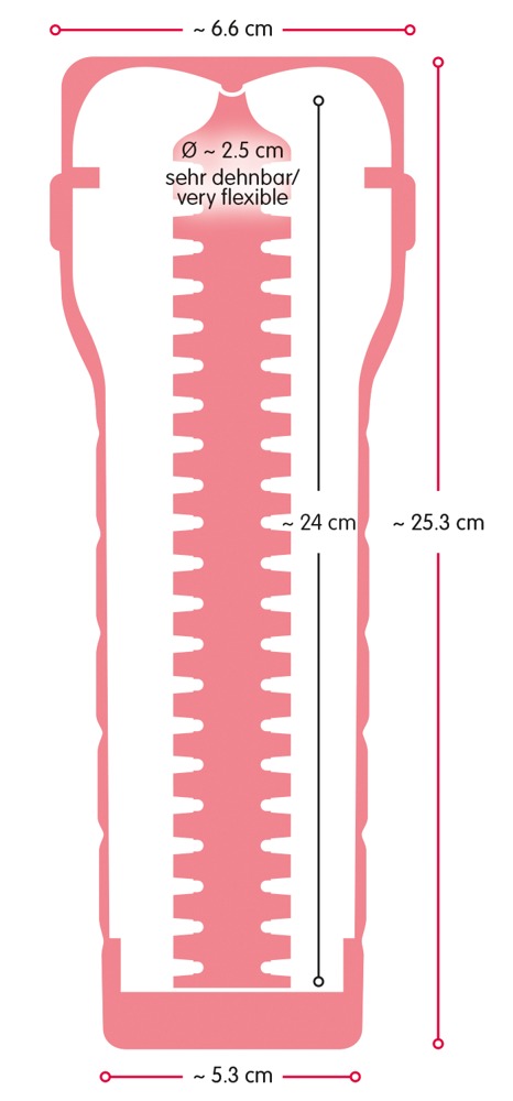 Gesamtlänge 25,3 cm, Einführtiefe: 24 cm, Ø 2,5 cm (dehnbar). TPE, PP.