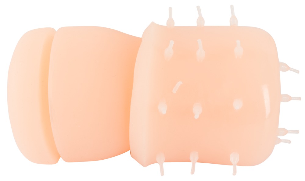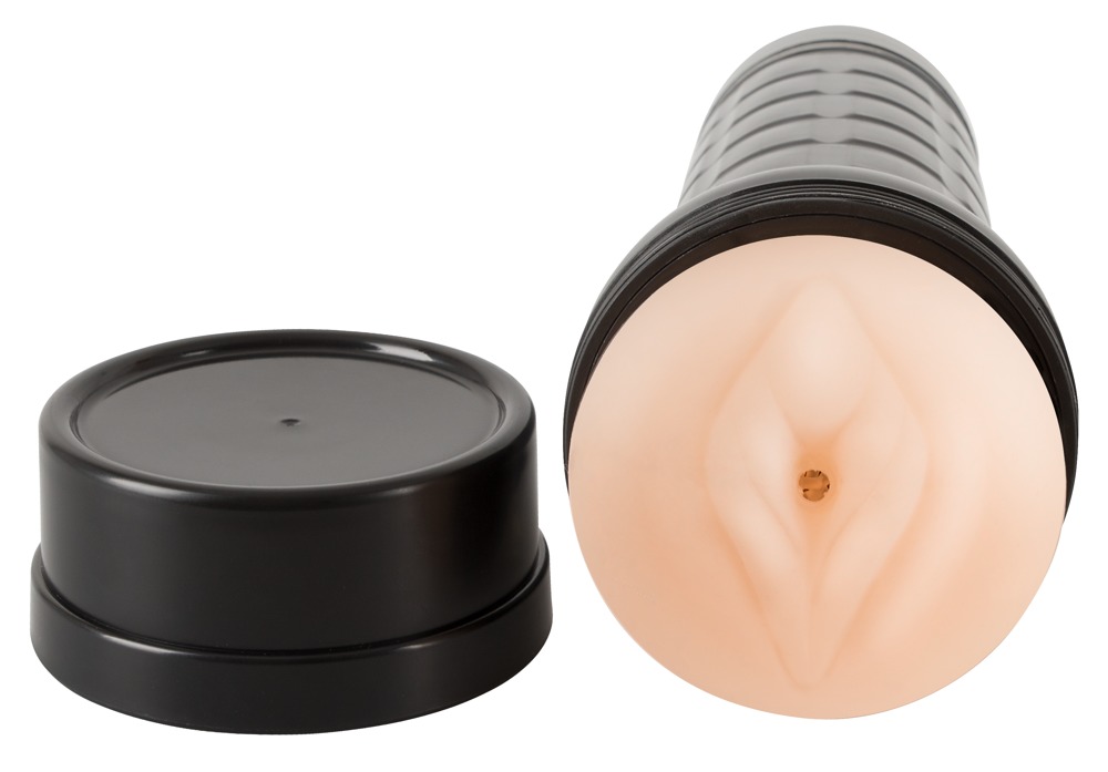 Masturbator mit Vagina-Öffnung und schwarzer Hülle. Der innen genoppte Lustkanal ist beidseitig geöffnet, sodass die Reinigung schnell und hygienisch erfolgen kann, dazu ist der Sleeve natürlich auch aus der Hülle entnehmbar.