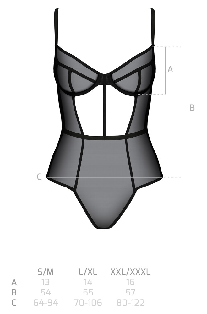 Softer anschmiegsamer Varella Body aus der Eco Collection von Passion komplett aus elastischem Powernet. Verführerisches Rio-Styling mit Front-Cut-out, hohen Beinausschnitten und Hakenverschluss im Schritt. Cups auf Bügel gearbeitet, die Träger sind für optimale Passform verstellbar. Im Rücken mit kleinem runden Cut-out unter dem 1er-Hakenverschluss.