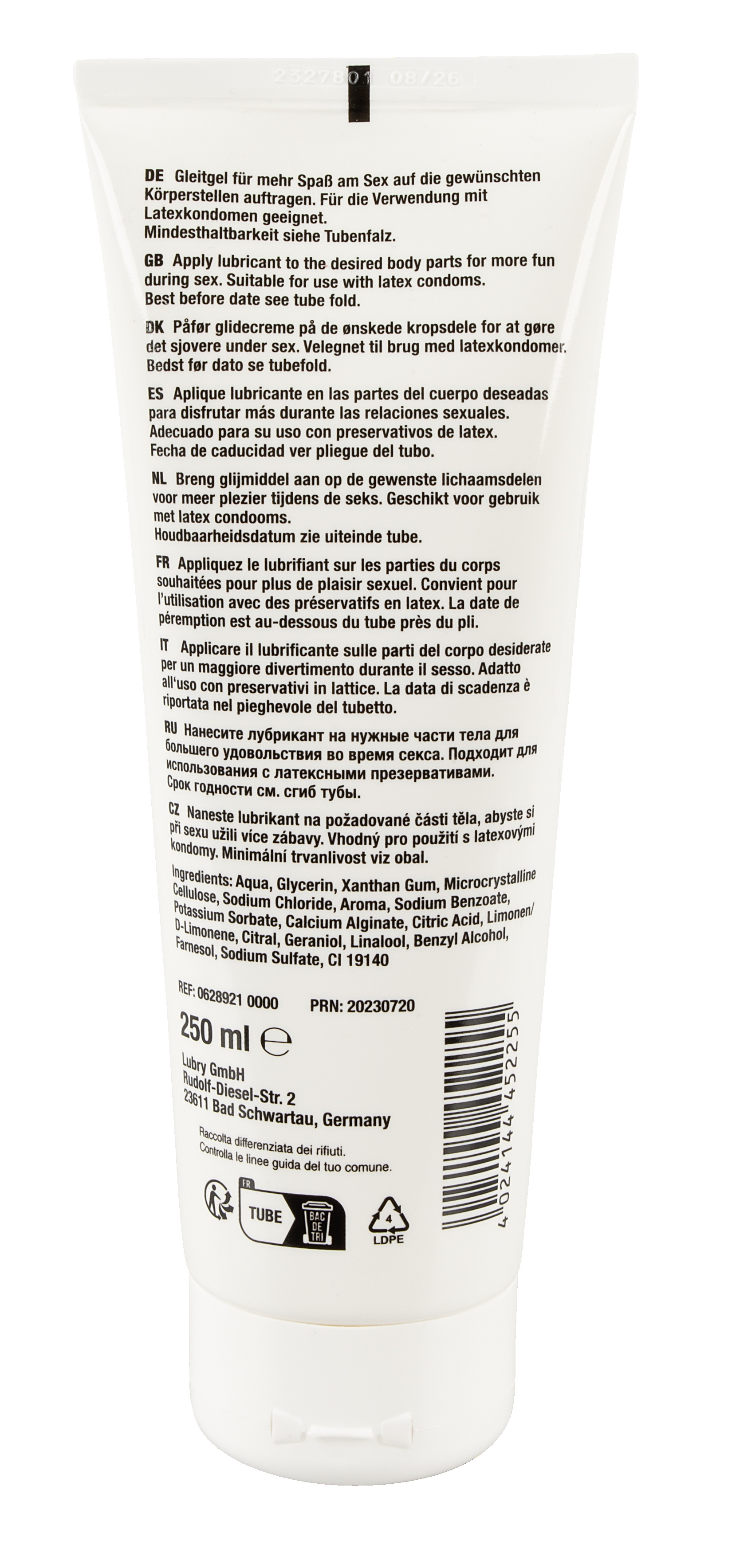 Aqua, Glycerin, Xanthan Gum, Microcrystalline Cellulose, Sodium Chloride, Aroma, Sodium Benzoate, Potassium Sorbate, Calcium Alginate, Citric Acid, Limonen/D-Limonene, Citral, Geraniol, Linalool, Benzyl Alcohol, Farnesol, Sodium Sulfate, CI 19140