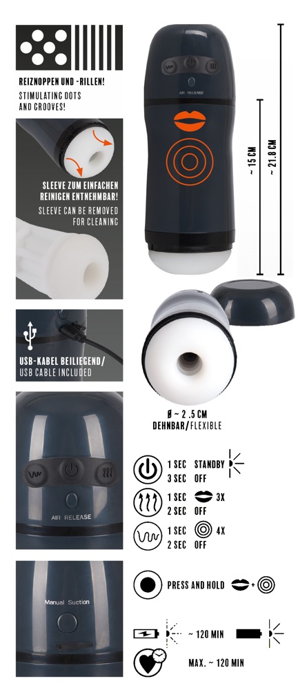 Dabei wird der Penis erst von der Sleeve mit aufregenden Noppen und tiefer von sanften Rillen empfangen und liebkost. Ein Sicherheitsventil sorgt währenddessen für die nötige Sicherheit, den Saugvorgang sofort abzubrechen und rückgängig zu machen.