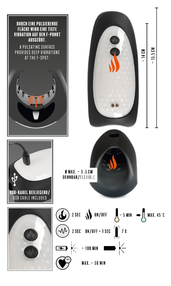 Masturbator mit einfach zu bedienender Wärmefunktion und 7 Vibrationsmodi. Verschiedene Reizstrukturen im Inneren sorgen für ein aufregendes Masturbationserlebnis.
