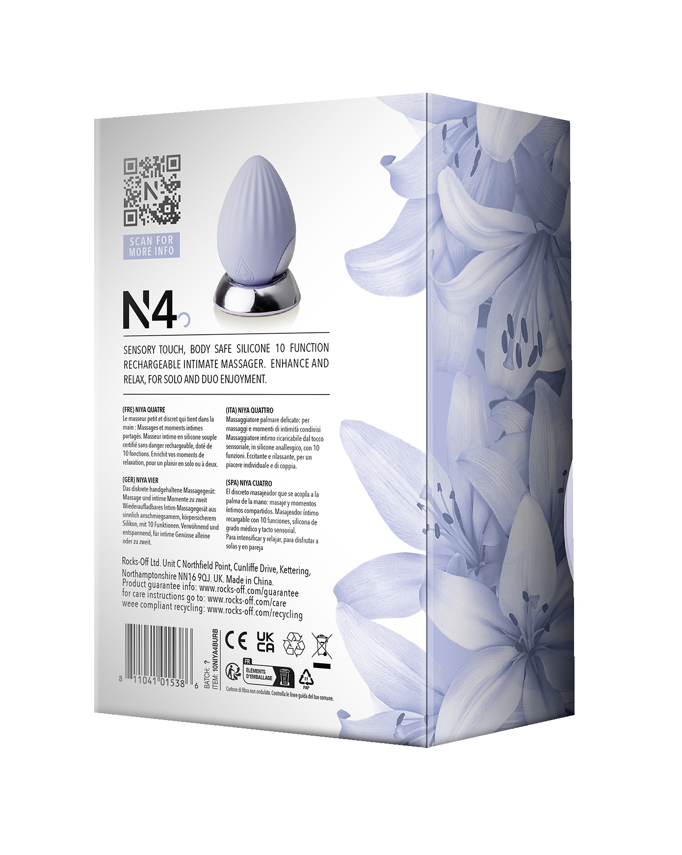 Entdecke mit dem handlichen Auflegevibrator NIYA 4 von Rocks off ein kraftvolles Vergnügen in kompakter Form. Sein ovales, sanft strukturiertes Design liegt perfekt in der Hand und verwöhnt speziell die Klitoris sowie alle äußeren Hotspots mit 10 aufregenden Vibrationsmodi.
